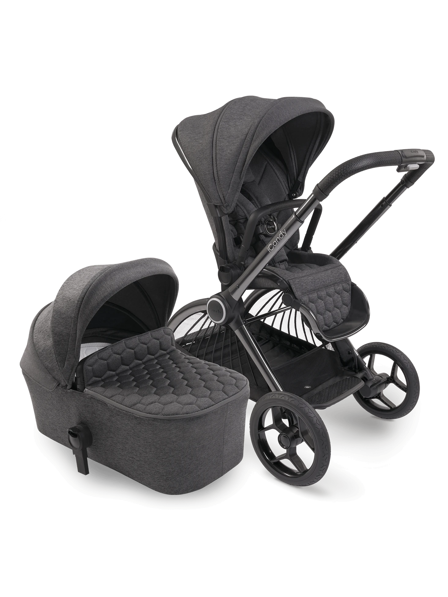 Andere kinderwagens komen met all terrain banden, hartstikke handig dat de kinderwagen op elk terrein gebruikt kan worden maar die grote wielen heb je niet altijd nodig en kunnen vooral bij vervoer soms best onhandig zijn. iCandy kiest er daarom voor om 2 sets wielen te leveren, een set kleine stadswielen en een set wielen voor wanneer je bijvoorbeeld een boswandeling gaat maken, ideaal!